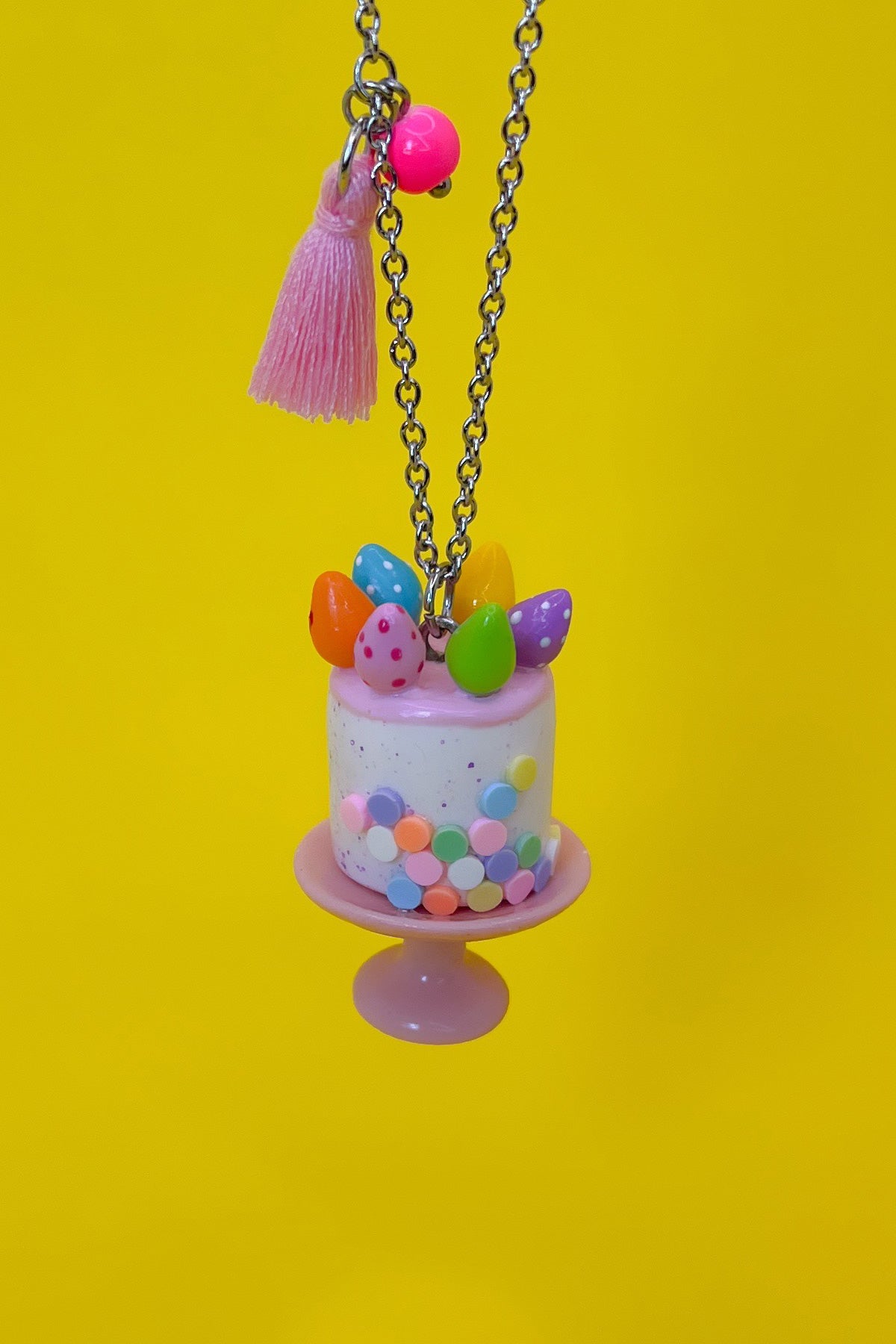 Ce collier se compose d'un magnifique gâteau miniature blanc picoté mauve, décoré de confettis colorés orné de 6 œufs de Pâques aux teintes vives.